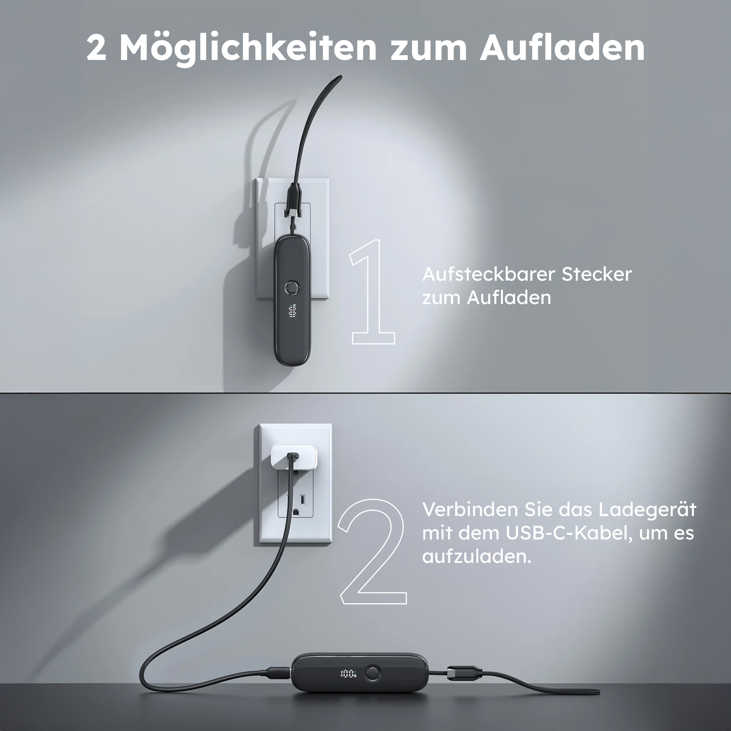 Laden überall - ohne Extra-Ladegerät: 2-in-1 Powerbank + Wall Charger, einfach in die Steckdose stecken und gleichzeitig bereit fürs nächste Laden sein.